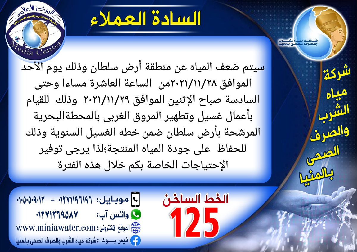 سيتم ضعف المياه عن منطقة ارض سلطان يوم الأحد الموافق ٢٠٢١/١١/٢٨ من الساعه العاشرة مساءا وحتى الساعة السادسة صباح الإثنين الموافق ٢٠٢١/١١/٢٩ وذلك للقيام بأعمال غسيل وتطهير المروق الغربى بالمحطه البحريه المرشحة بارض سلطان ضمن خطة الغسيل السنويه حفاظا على جودة المياه المنتجة ؛لذا يرجى توفير الإحتياجات الخاصة بكم خلال هذه الفترة