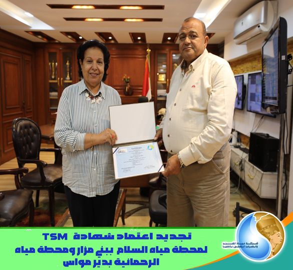 مياه المنيا : تجديد اعتماد شهادة TSM لمحطة مياه السلام ببني مزار ومحطة مياه الرحمانية بدير مواس