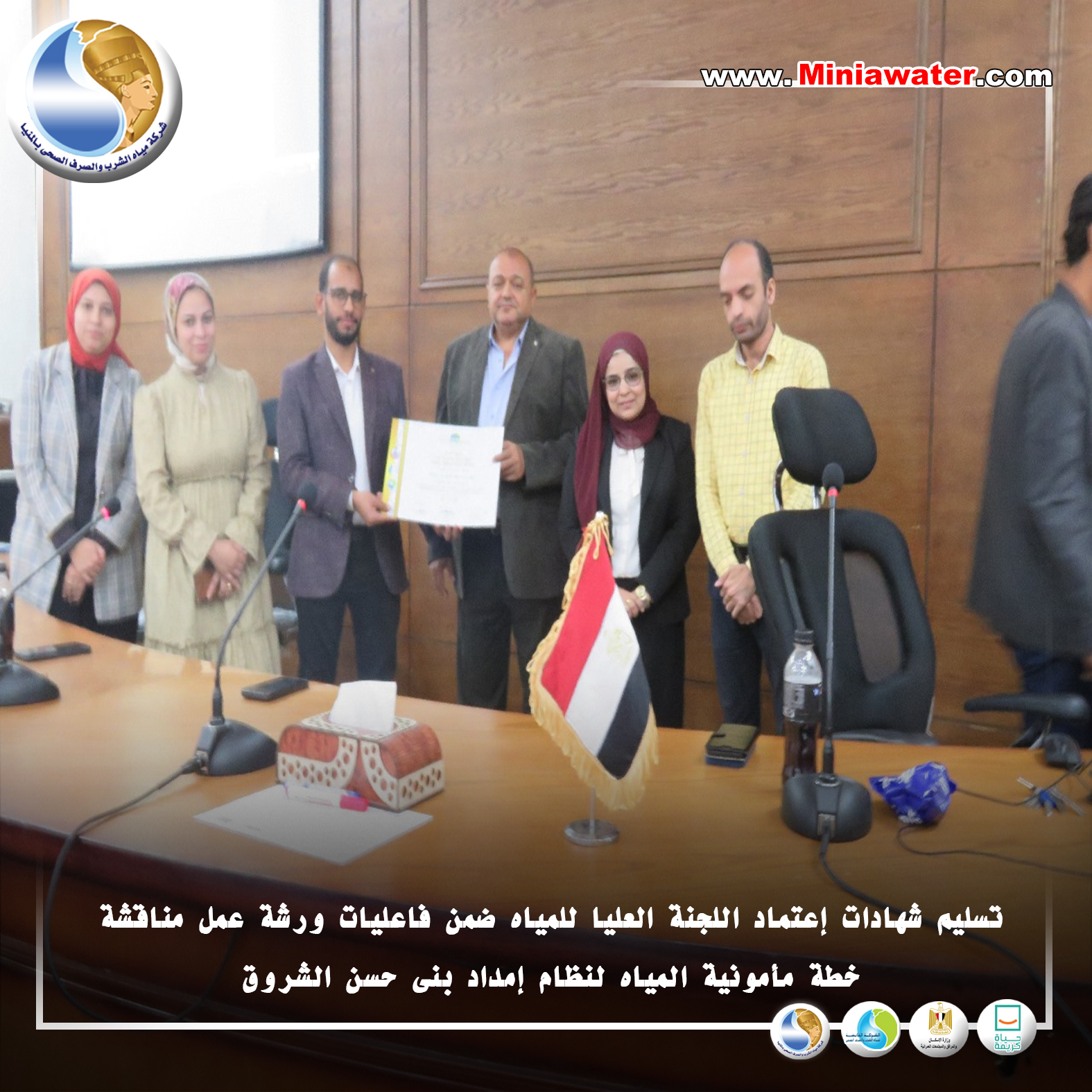 مياه المنيا تتسلم شهادات إعتماد اللجنة العليا للمياه ضمن فاعليات ورشة عمل مناقشة خطة مأمونية المياه لنظام إمداد بنى حسن الشروق.