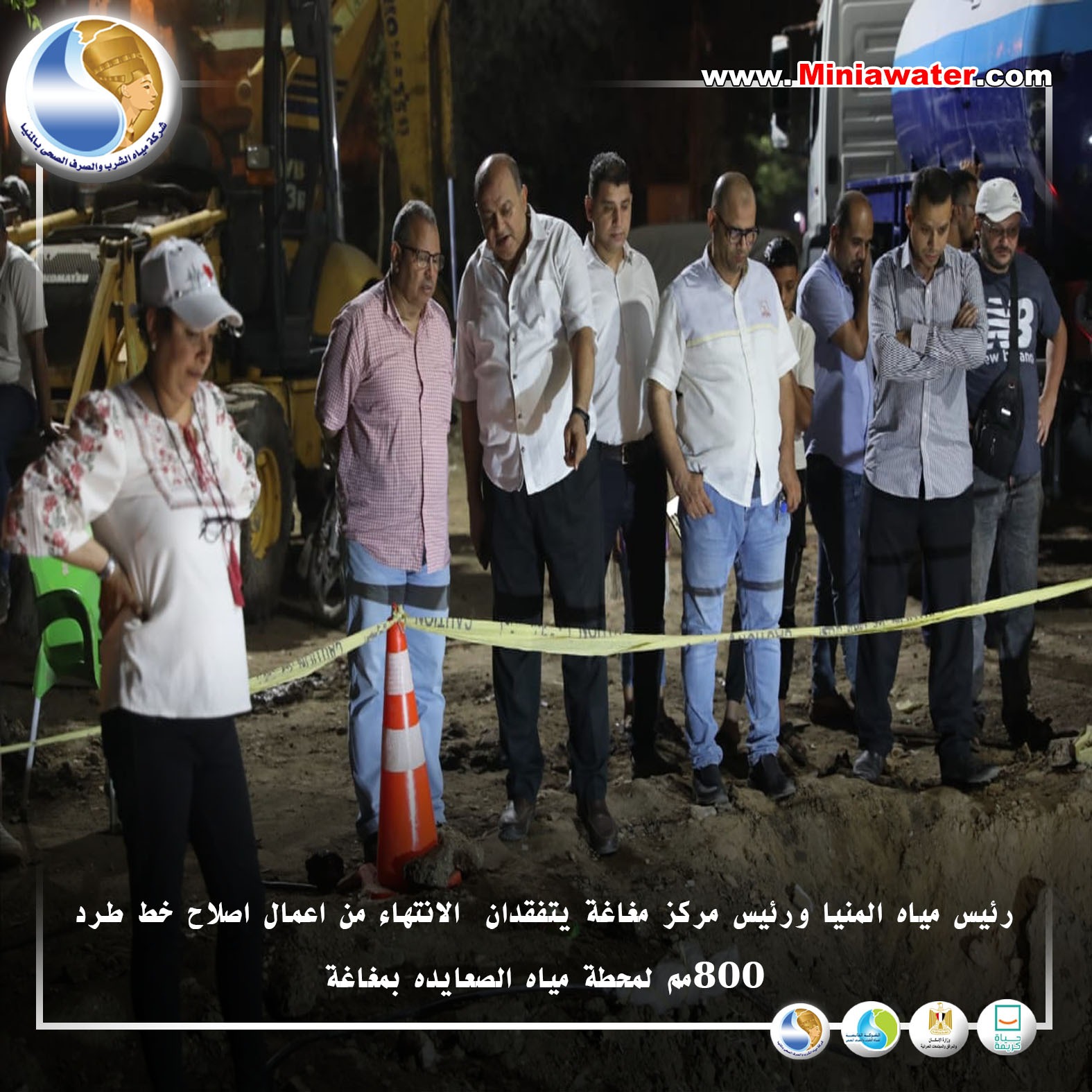 رئيس مياه المنيا ورئيس مركز مغاغة يتفقدان الانتهاء من اعمال اصلاح خط طرد 800مم لمحطة مياه الصعايده بمغاغة