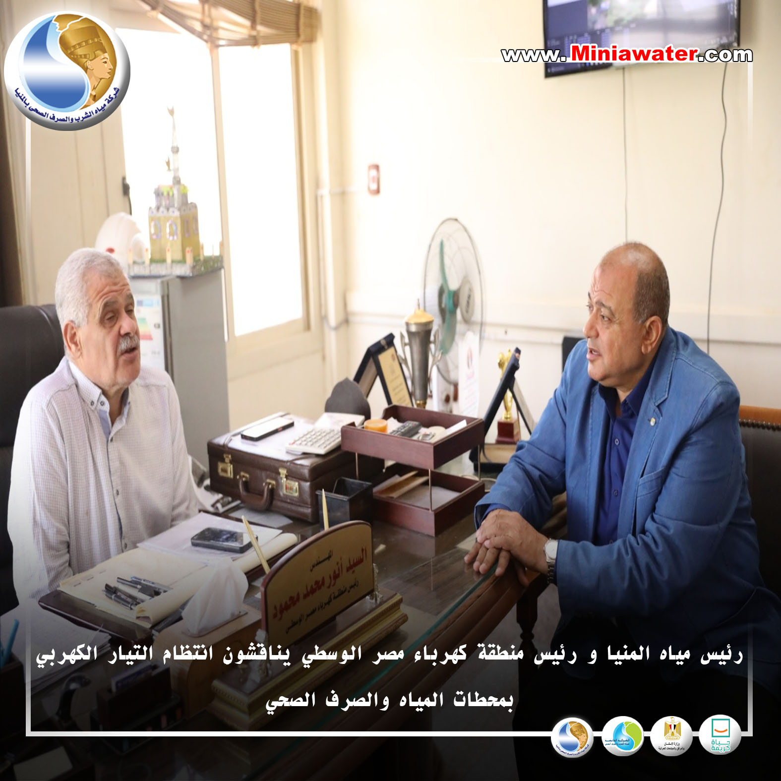 رئيس مياه المنيا و رئيس منطقة كهرباء مصر الوسطي يناقشون انتظام التيار الكهربي بمحطات المياه والصرف الصحي.