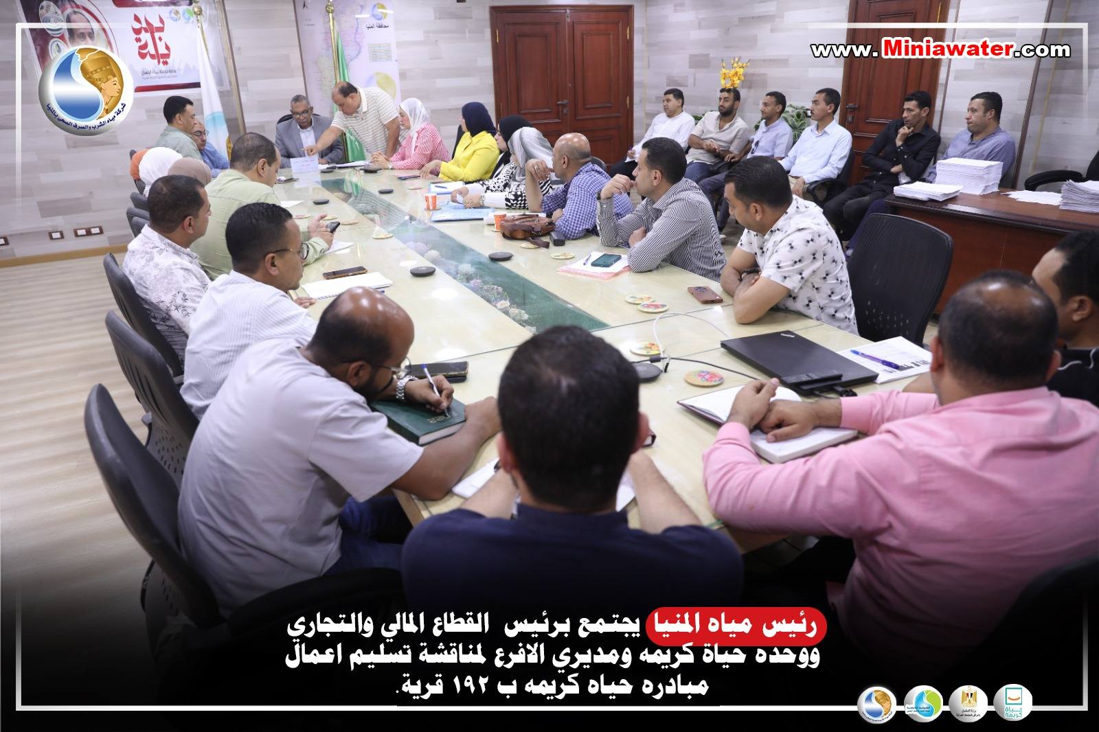 رئيس مياه المنيا يجتمع برئيس القطاع المالي والتجاري ووحده حياة كريمه ومديري الافرع لمناقشة تسليم اعمال مبادره حياه كريمه ب ١٩٢ قرية.