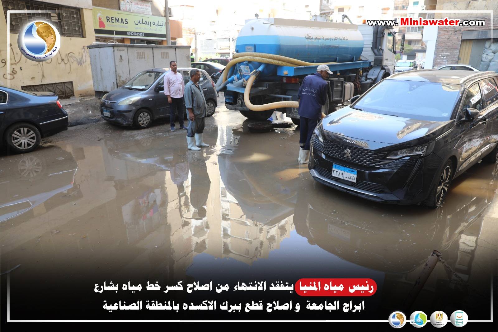 رئيس مياه المنيا يتفقد الانتهاء من اصلاح كسر خط مياه بشارع ابراج الجامعة و اصلاح قطع ببرك الاكسده بالمنطقة الصناعية