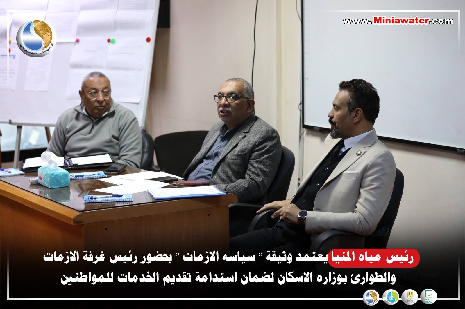 رئيس مياه المنيا يعتمد وثيقة " سياسه الازمات " بحضور رئيس غرفة الازمات والطوارئ بوزاره الاسكان لضمان استدامة تقديم الخدمات للمواطنين