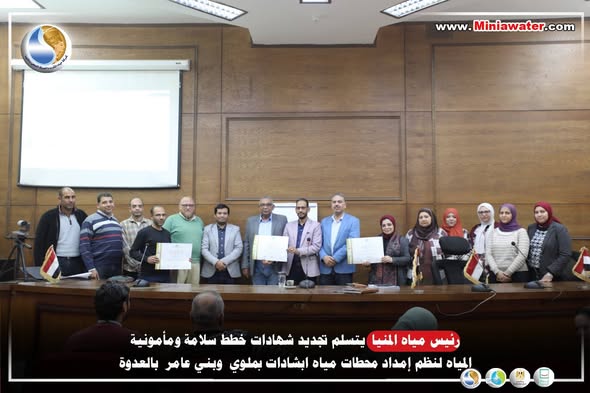 رئيس مياه المنيا يتسلم تجديد شهادات خطط سلامة ومأمونية المياه لنظم إمداد محطات مياه ابشادات بملوي وبني عامر بالعدوة