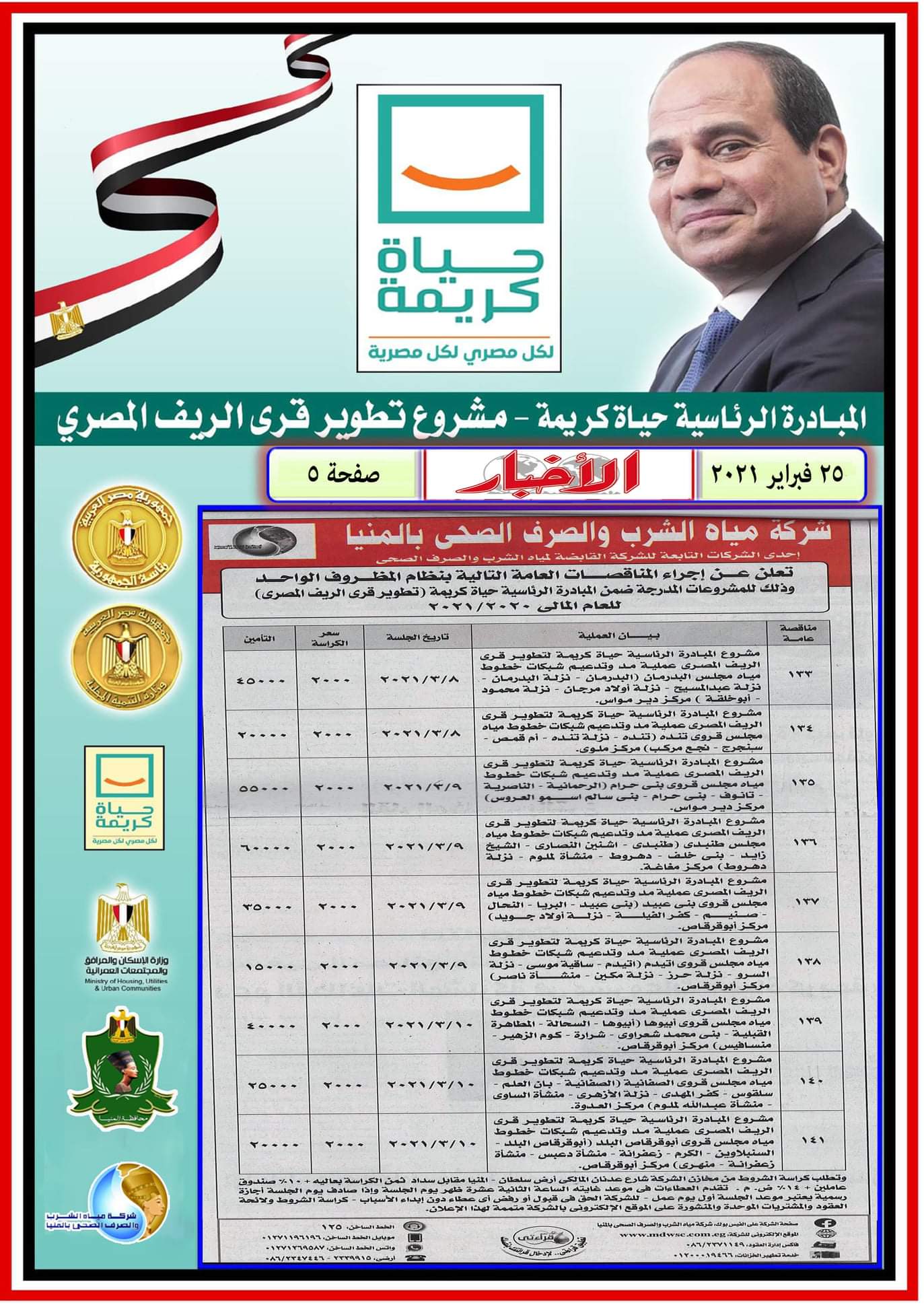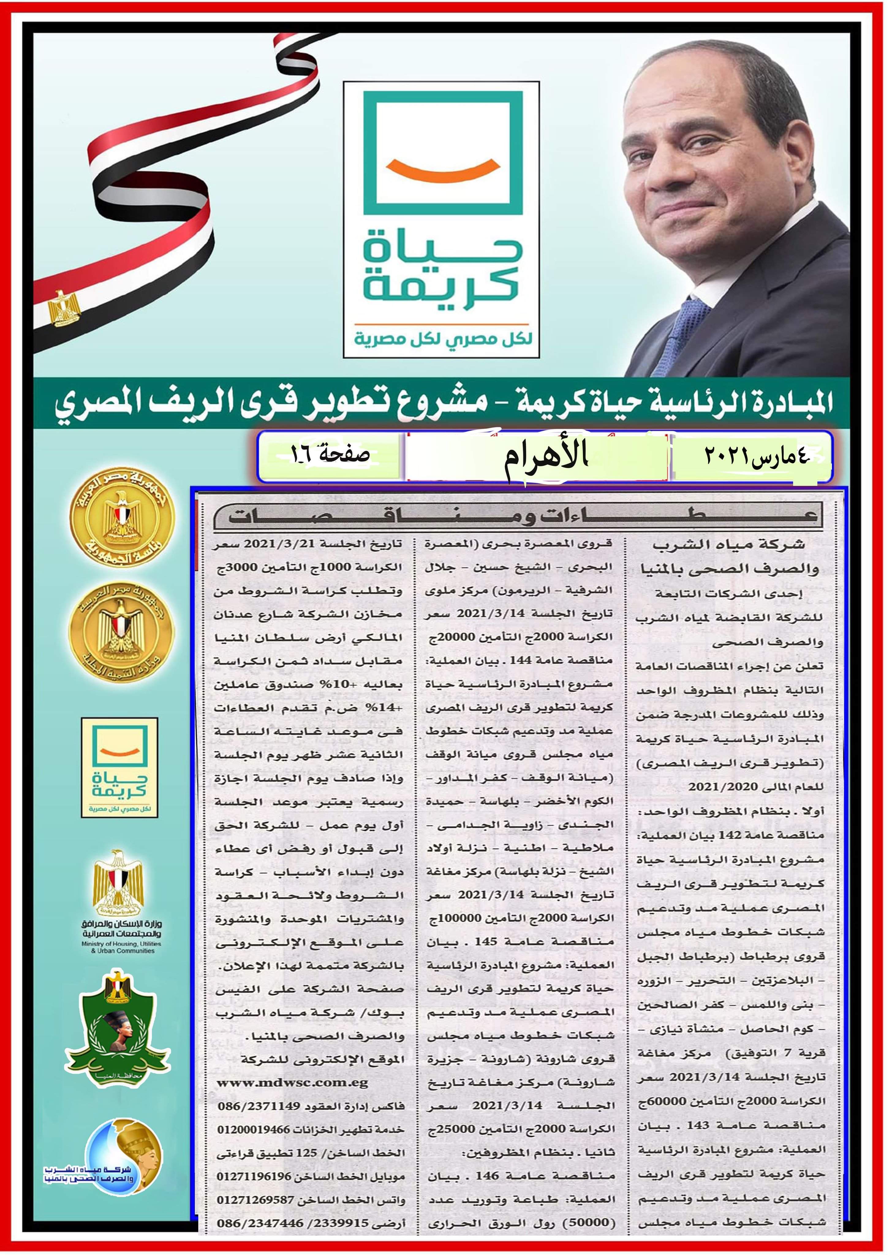 مناقصة خاصة بحياة كريمة الإثنين ٢٠٢١/٣/٢٢