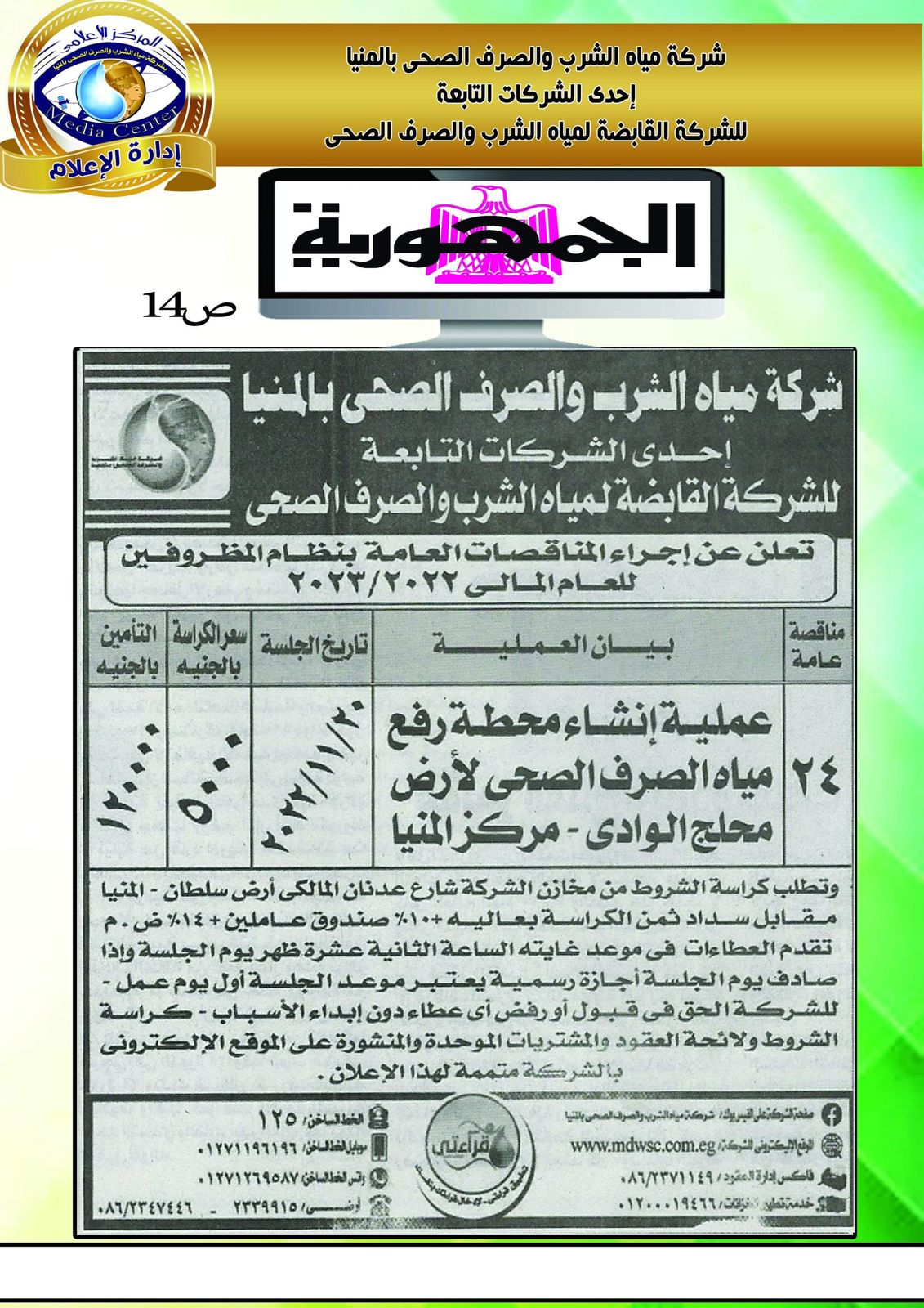 مناقصه بنظام المظروفين لعملية إنشاء محطة رفع مياه الصرف الصحى لأرض محلج الوادى - مركز المنيا