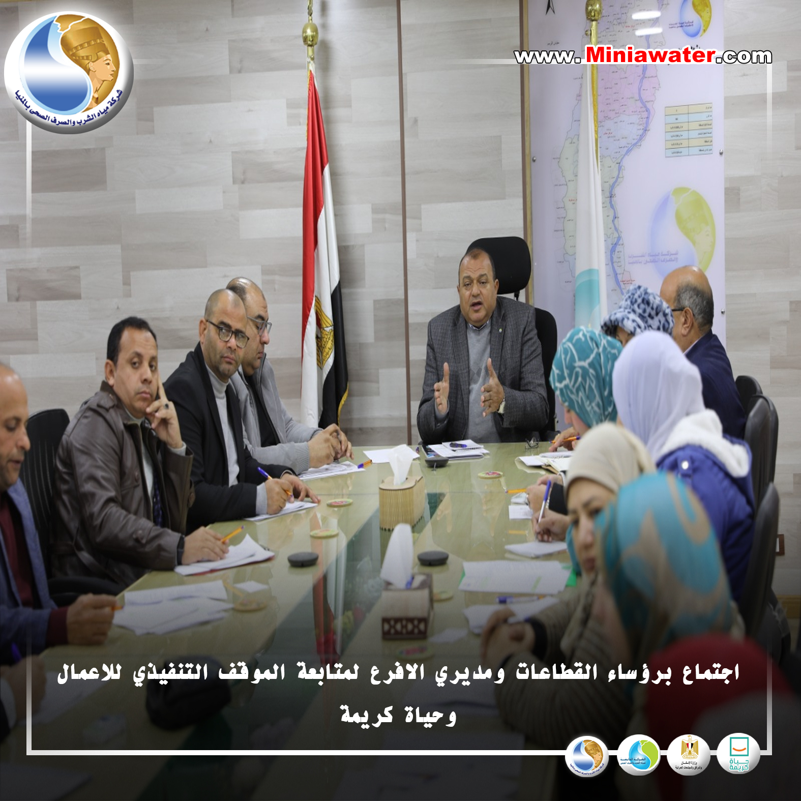 رئيس مياه المنيا يجتمع برؤساء القطاعات ومديري الافرع لمتابعة الموقف التنفيذي للاعمال وحياة كريمة .