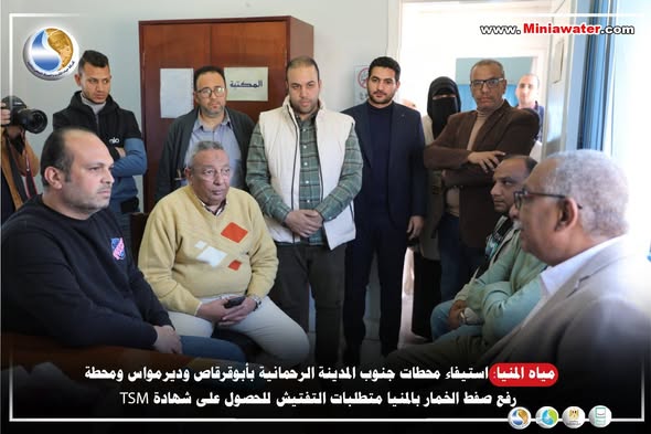مياه المنيا: استيفاء محطات جنوب المدينة الرحمانية بأبوقرقاص وديرمواس ومحطة رفع صفط الخماربالمنيا متطلبات التفتيش للحصول على شهادة TSM