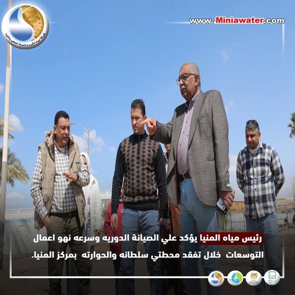 رئيس مياه المنيا يؤكد علي الصيانة الدوريه وسرعه نهو اعمال التوسعات خلال تفقد محطتي سلطانه والحوارته بمركز المنيا.