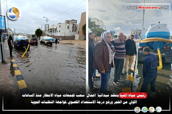 رئيس مياه المنيا يتفقد ميدانيا اعمال سحب تجمعات مياه الامطار منذ الساعات الاولي من الفجر ورفع درجة الاستعداد القصوي لمواجهة التقلبات الجوية